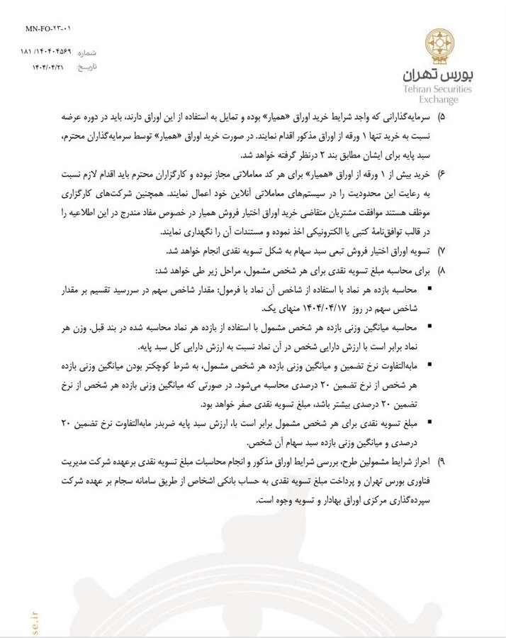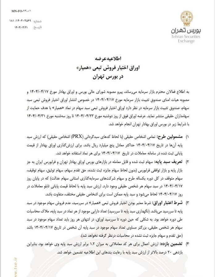 به گزارش پایگاه خبری «عصر بازار» به نقل از سنا، مهدی زمانی، با بیان اینکه طبق اطلاع رسانی‌های پیشین، از امروز نماد «همیار» در بورس تهران گشایش یافت و آماده خرید توسط سهامدارانی است که ارزش پرتفوی آن‌ها در تاریخ 17 تیرماه 1404 حداکثر 500 میلیون تومان بوده، افزود: اشخاص می‌توانند با خرید یک برگ اوراق از نماد «همیار» به ارزش معاملاتی «یک ریال» از طریق سامانه‌های کارگزاری، پرتفوی خود را به میزان حداقل 20 درصد در بازه زمانی یک‌سال آینده بیمه کنند. البته شرط استفاده از بیمه با نرخ تضمین 20 درصدی، عدم فروش سهام موجود در پرتفوی مورخ 17 تیرماه 1404 خواهد بود. البته فروش دارایی از خریدهای بعدی تا میزانی که از پرتفوی 17 تیر کمتر نشود، خللی در اعتبار بیمه «همیار» ایجاد نخواهد کرد.