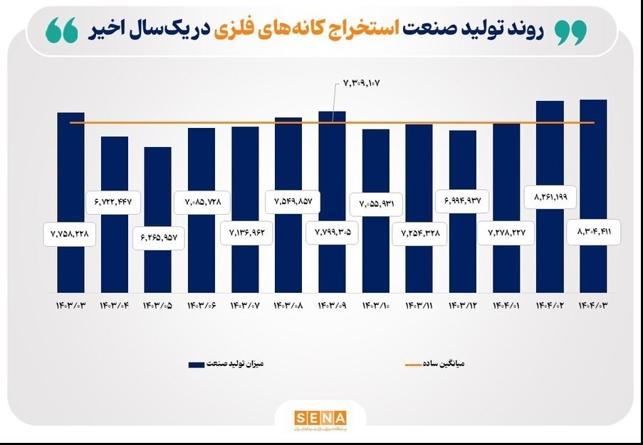افزون براین، میزان تولید صنعت استخراج کانههای فلزی در خرداد امسال نسبت به خرداد پارسال با رشد 7 درصدی از 7 میلیون و 758 هزار تن در خرداد پارسال به 8 میلیون و 304هزار تن در خرداد امسال رسیده است.