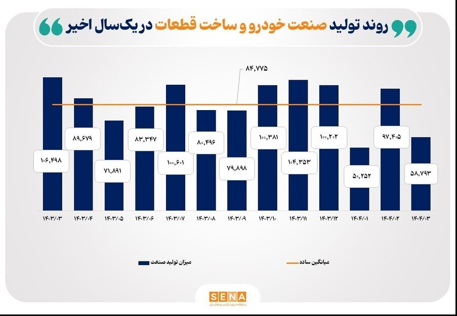 هم چنین، میزان تولید خودروسازان در خرداد ماه سال 1404 نسبت به اردیبهشت ماه نیز 40 درصد کاهش یافته است. این کاهش عمدتا ناشی از کاهش تولید نمادهای خپارس (کاهش تولید گروه Q200 به میزان 52 درصد)، خزامیا (کاهش 37 درصد گروه نیسان) و خاور (کاهش 62 درصد گروه ون و پیکاپ و به صفر رسیدن تولید کامیون سبک) به ترتیب به میزان 48 ، 39 و 48 درصد است.