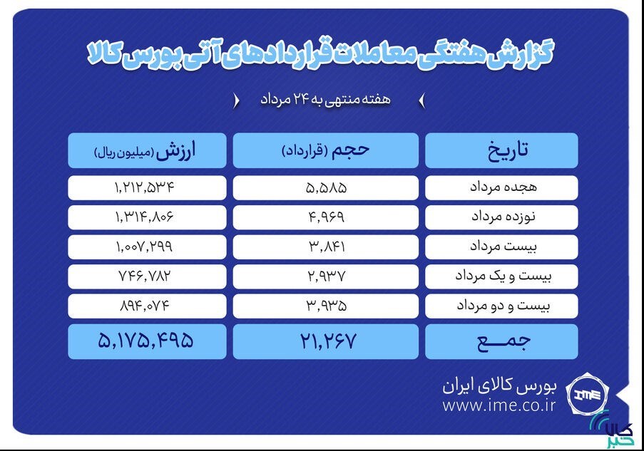 عصر بازار- بررسی روند معاملات قراردادهای آتی بورس کالای ایران درهفته منتهی به ۲۴ مرداد نشان می دهد که در هفته گذشته ارزش معاملات بازار آتی به بیش از ۵۱۷ میلیارد تومان رسید.
