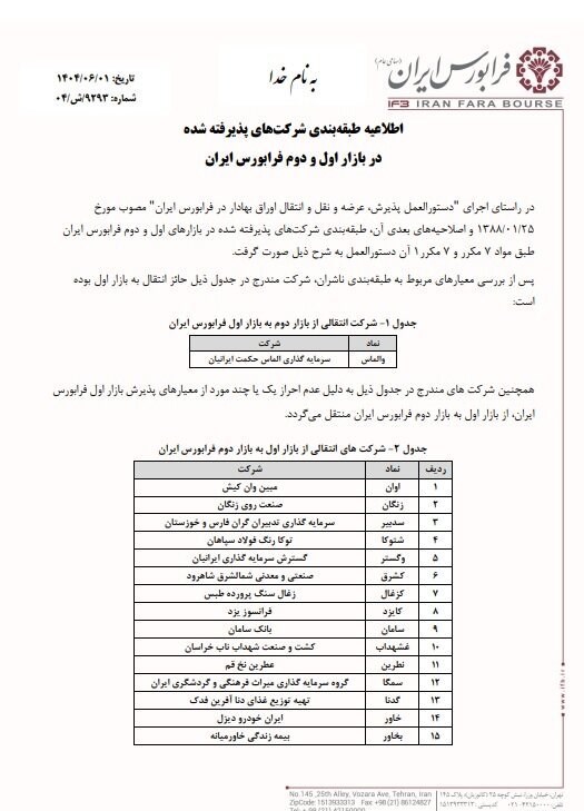 همچنین 17 شرکت به دلیل احراز نشدن یک یا چند مورد از معیارهای پذیرش بازار اول فرابورس، از بازار اول به بازار دوم منتقل خواهند شد.