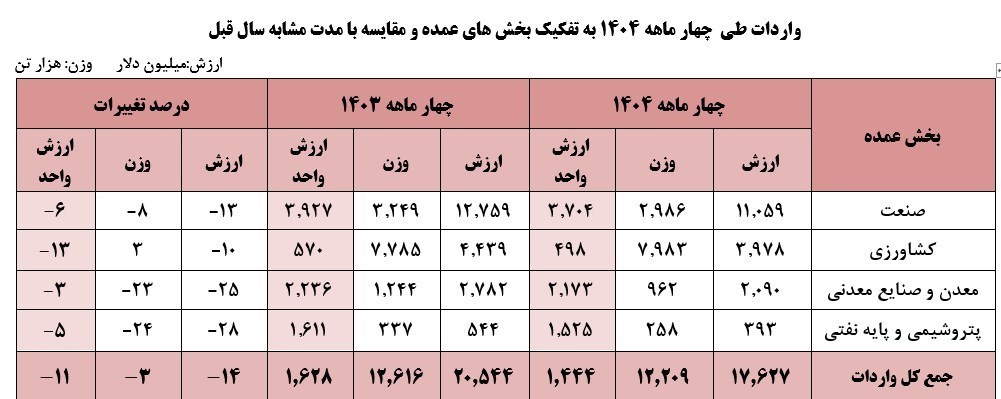 مدیرکل دفتر برنامهریزی و پایش سازمان توسعه تجارت ایران ادامه داد: واردات کشور طی چهار ماهه 1404 به 12 میلیون و 209هزار تن و به ارزش 17 میلیارد و 29 میلیون دلار رسیده است که نسبت به مدت مشابه سال قبل سه درصد از نظر وزن و 14 درصد از نظر ارزش کاهش داشته است.