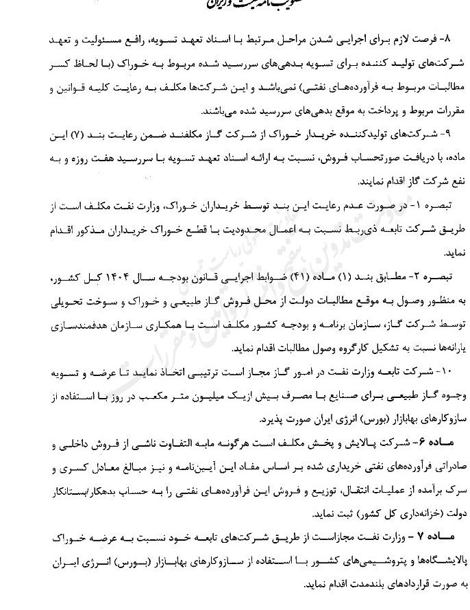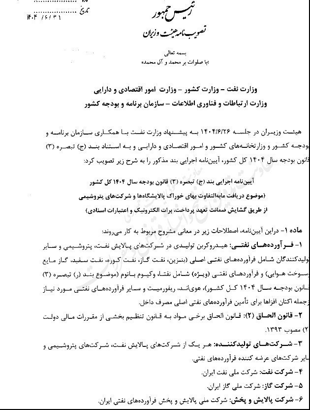 در متن تصویب‌نامه هیات وزیران آمده است: مابه‌التفاوت بهای خوراک تحویلی به پالایشگاه‌ها و شرکت‌های پتروشیمی، اعم از مایع یا گاز، که ناشی از اختلاف میان نرخ تکلیفی و بهای واقعی است، باید به خزانه‌داری کل کشور واریز شود. دولت برای تسهیل این فرآیند و جلوگیری از بروز مشکلات مالی در جریان نقل و انتقال، مقرر کرده است که دریافت این مبالغ می‌تواند از طریق ابزارهای مالی رسمی نظیر گشایش ضمانت تعهد پرداخت، برات الکترونیک و اعتبار اسنادی صورت گیرد.