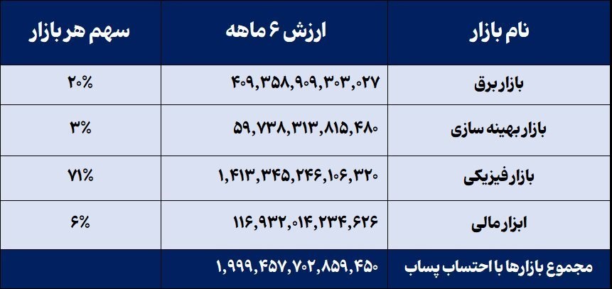 مدیرعامل بورس انرژی در نیمه نخست سال جاری، مجموع ارزش بازار برق بورس انرژی ایران را در حدود 55 میلیارد کیلووات ساعت برق، نزدیک به 40.9 همت اعلام کرد و گفت: در این میان، تابلوی برق آزاد با 27.9 همت بیشترین ارزش ریالی و تابلوی برق عادی با 47 میلیارد کیلوواتساعت بیشترین حجم معاملات را به خود اختصاص دادهاند. در نیمه نخست سال جاری، متوسط قیمت برق عادی 1774 ریال، متوسط قیمت برق سبز 65,543 ریال، متوسط قیمت برق آزاد 65,419 ریال با حداقل 18,000 و حداکثر 730,000 ریال ثبت شده است. همچنین متوسط قیمت برق خودتأمین صنایع 16,754 ریال بوده که دامنه آن بین 11,874 تا 70,000 ریال متغیر بوده است.
