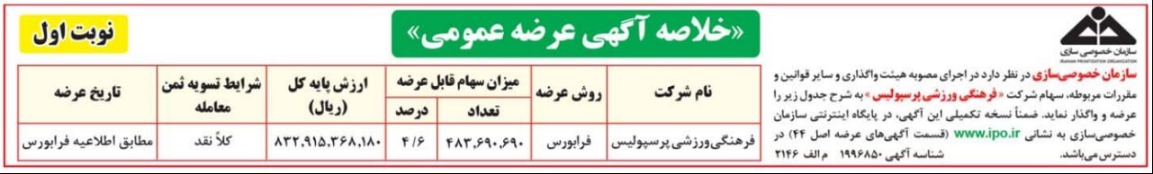 به گزارش پایگاه خبری «عصر بازار» به نقل از ایرنا، آن‌گونه که سازمان خصوصی‌سازی اعلام کرده، طی معاملات سه‌شنبه (8 مهر ماه) فرابورس، بلوک 4.6 درصدی از سهام دولت (وزرات ورزش و جوانان) در شرکت فرهنگی ورزشی پرسپولیس با قیمت پایه هر سهم 1784 ریال عرضه شد که با توجه به رقابت میان دو متقاضی خرید، روند واگذاری به روز بعد موکول شد.