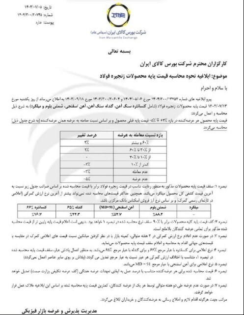 به گزارش پایگاه خبری «عصر بازار» به نقل از ایسنا، ابلاغیه جدید بورس کالا در خصوص ضرایب جدید قیمت پایه (مواد اولیه) زنجیره فولاد از روز یکشنبه (13 مهرماه) اجرایی شد و این در حالی بود که در تاریخ هفتم مردادماه 1404، انجمن تولیدکنندگان فولاد ایران به اتفاق انجمن سنگ آهن و انجمن نوردکاران توافق نامهای را بر سر نسبتهای قیمتی در زنجیره فولاد کشور به عنوان حداکثر پایه قیمتی معاملاتی در بورس کالا اعلام کرده و آن را به وزارت صمت ارائه داده تا وزارت صمت آن را به بورس کالا پیشنهاد دهد.