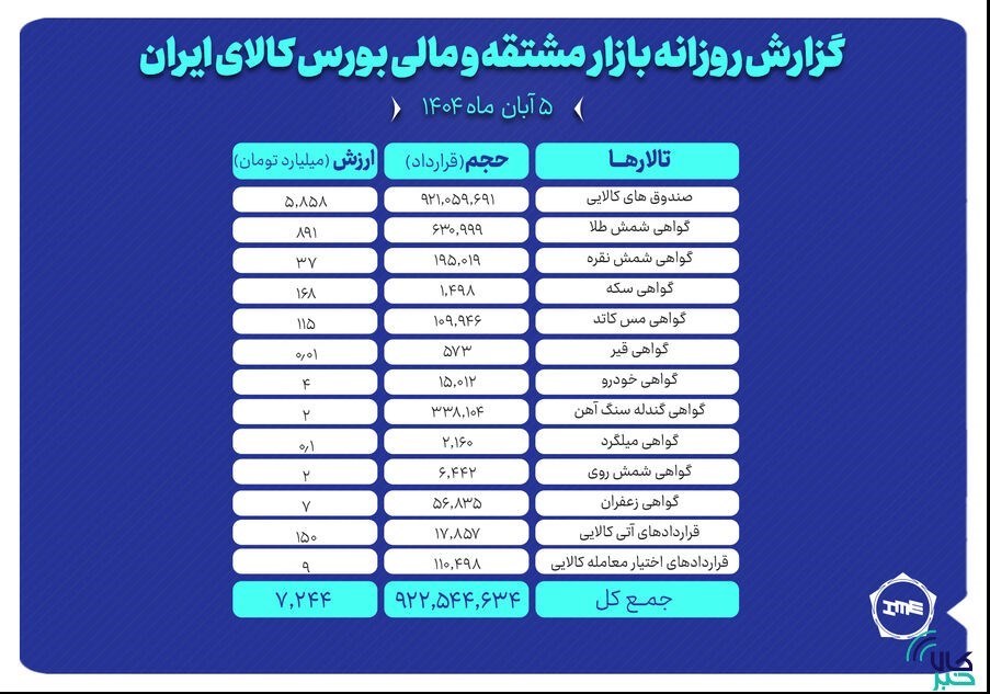 عصر بازار- روز گذشته در بازار مشتقه و مالی بورس کالای ایران ۹۲۲ میلیون و ۵۴۴هزار و ۶۳۴ قرارداد به ارزش ۷ هزار و ۲۴۴ میلیارد تومان منعقد شد.