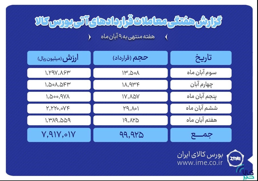 به گزارش پابگاه خبری «عصر بازار» به نقل از کالاخبر ،در هفته گذشته 99 هزار و 925 قرارداد آتی به ارزش 792 میلیارد تومان منعقد شد. بیشترین حجم و ارزش معاملات نیز به روز 6 آبان اختصاص یافت به طوری که در این روز 29 هزار و 801 قرارداد به ارزش بیش از 220 میلیارد تومان منعقد شد.