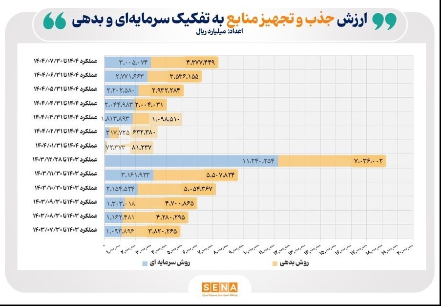 عصر بازار- گزارش مدیریت پژوهش سازمان بورس و اوراق بهادار نشان می‌دهد در ۷ ماه امسال ارزش تجهیز و تأمین منابع مالی از طریق بازار سرمایه با ۵۰ درصد رشد نسبت به مدت مشابه سال قبل به ۷۳۸ همت رسیده است. به این ترتیب معادل ۴۰ درصد از عملکرد سال قبل در ۷ ماه امسال محقق شده است.