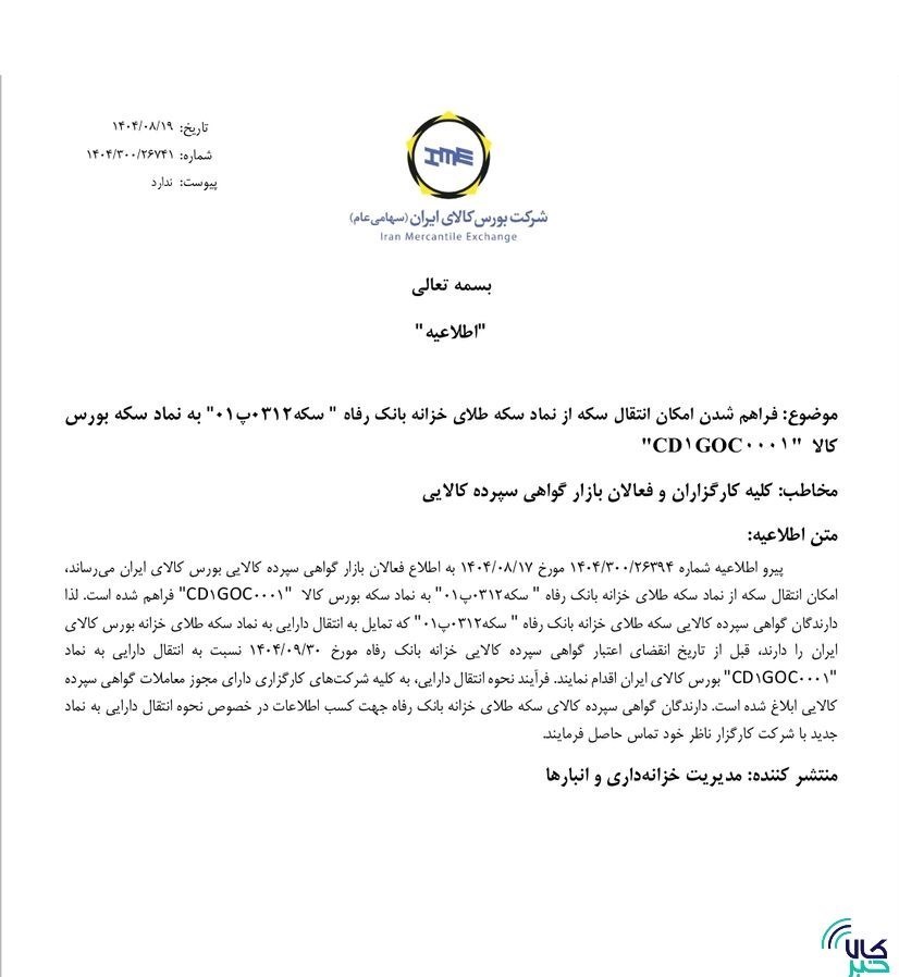 دارندگان گواهی سپرده کالایی سکه طلای خزانه بانک رفاه "سکه 0312پ01" که تمایل به انتقال دارایی به نماد سکه طلای خزانه بورس کالای ایران را دارند قبل از تاریخ انقضای اعتبار گواهی سپرده کالایی خزانه بانک رفاه مورخ 1404/09/30 نسبت به انتقال دارایی به نماد CD1GOC0001 بورس کالای ایران اقدام نمایند.