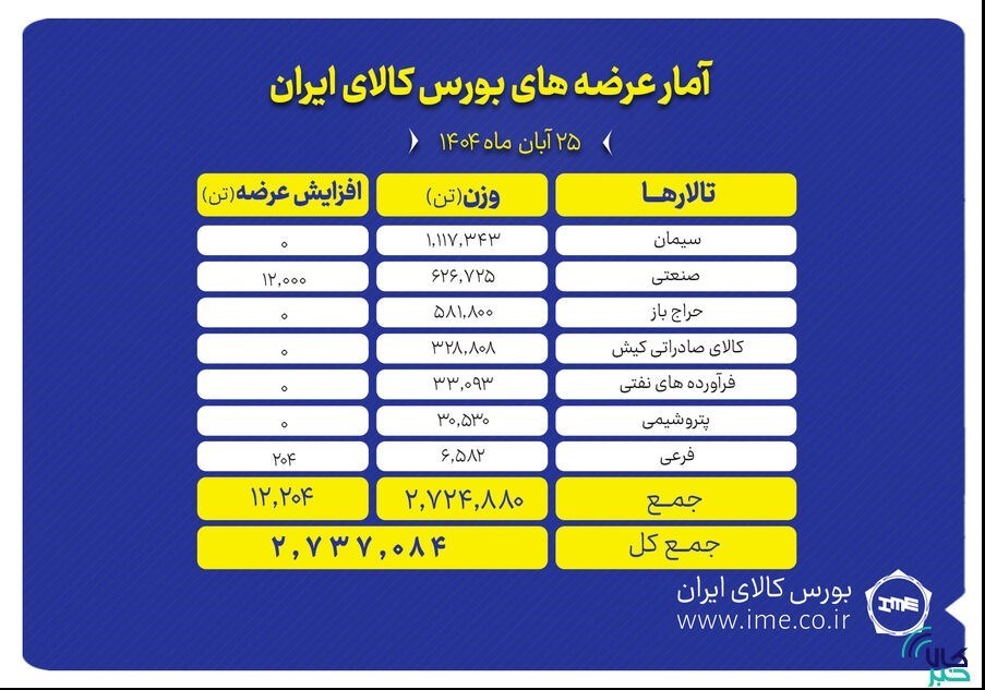 عصر بازار- تالارهای بورس کالای ایران امروز یکشنبه ۲۵ آبان ماه میزبان عرضه ۲ میلیون و ۷۳۷ هزار و ۸۴ تن محصول است.