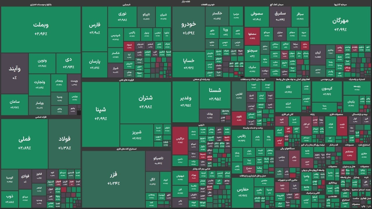نمادهای فارس و فملی حدود 12 هزار واحد در رشد شاخص اثرگذار بودند. نمادهای پُرتراکنش نیز مهرگان (جدیدالعرضه)، وبملت، خودرو و خساپا بودند که به جز نماد خودرو که رشد 1.6 درصد داشت، بقیه نمادها رشد تقریبا 3 درصدی در ارزش سهام و جابجایی بیش از 2 میلیاردی در تعداد سهام داشتند.