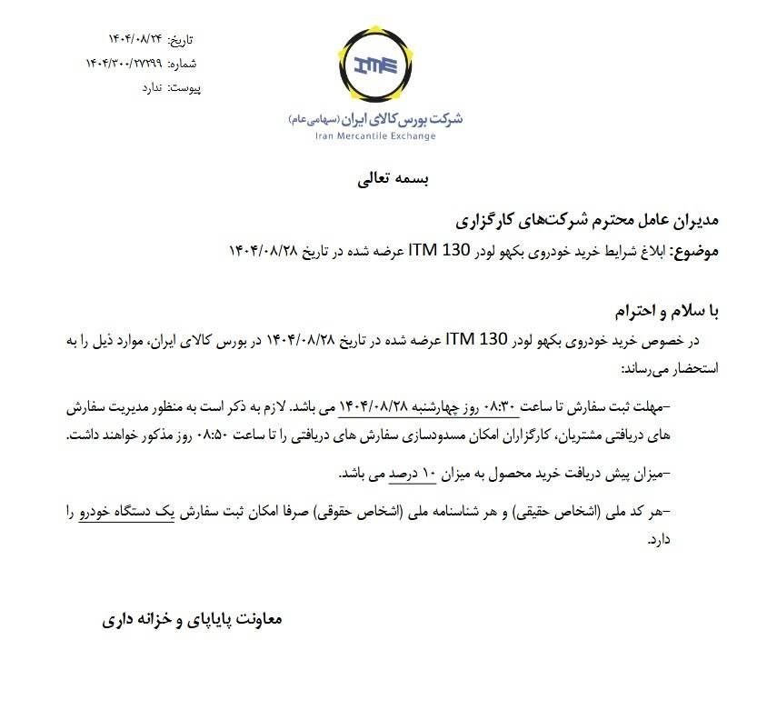 عصر بازار- بورس کالای ایران شرایط خرید خودروی بکهو لودر ITM۱۳۰ را برای عرضه ۲۸ آبان ماه در تالار خودرو اعلام کرد.