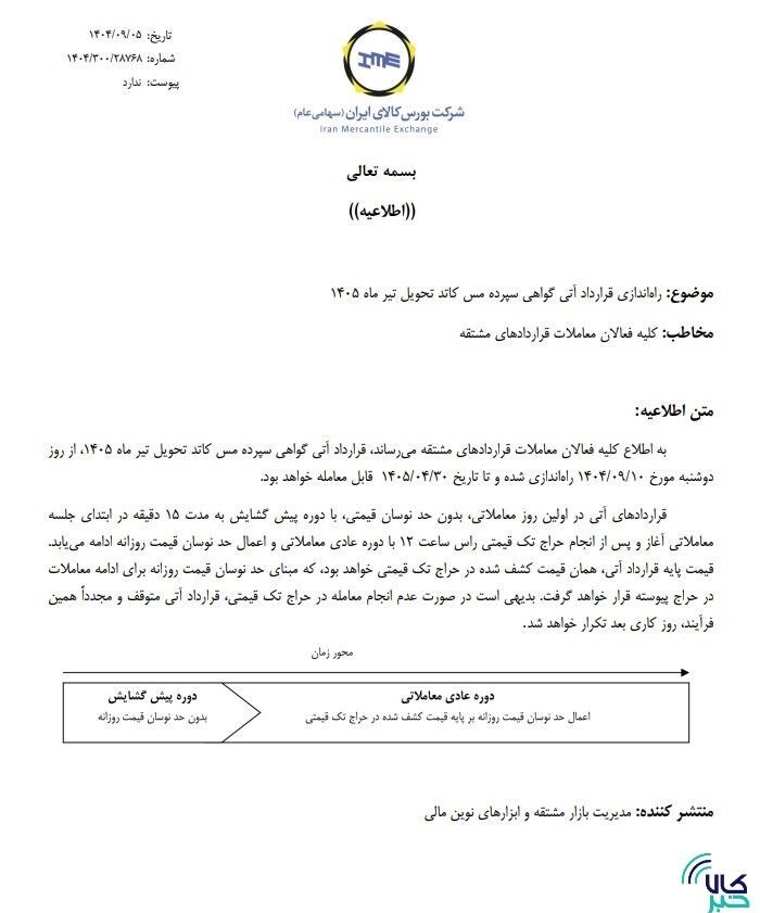 به گزارش پایگاه خبری «عصر بازار» به نقل از کالاخبر،بر اساس اعلام مدیریت بازار مشتقه و ابزارهای نوین مالی بورس کالا، قراردادهای آتی در اولین روز معاملاتی، بدون حد نوسان قیمتی، با دوره پیش گشایش به مدت ١٥ دقیقه در ابتدای جلسه معاملاتی آغاز و پس از انجام حراج تک قیمتی راس ساعت ١٢ با دوره عادی معاملاتی و اعمال حد نوسان قیمت روزانه ادامه می یابد.