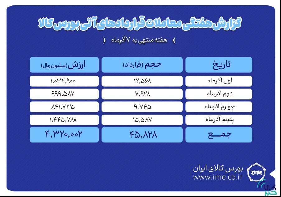 به گزارش پایگاه خبری «عصر بازار» به نقل از کالاخبر ، در هفته گذشته 45 هزار و 828 قرارداد آتی به ارزش 432 میلیارد تومان منعقد شد. بیشترین حجم و ارزش معاملات نیز به روز 5 آذرماه اختصاص یافت به طوری که در این روز 15هزار و 587 قرارداد به ارزش بیش از 144 میلیارد تومان منعقد شد.