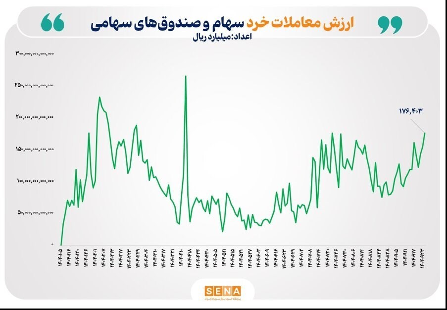 عصر بازار- بالاترین ارزش معاملات خرد سهام و صندوقهای سهامی امروز پس از جنگ ۱۲ روزه با ثبت رکوردی تازه از مرز ۱۷.۶ همت عبور کرد. پیشتر، ارزش این معاملات در ۲۱ مهر امسال ۱۷ هزار و ۶۳۹ میلیارد تومان بود.