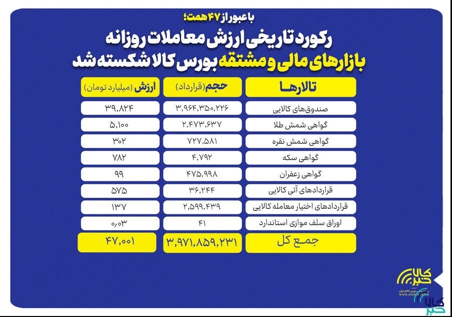 به گزارش پایگاه خبری «عصر بازار» به نقل از کالاخبر ، روز گذشته در بازار مشتقه و مالی بورس کالای ایران 3 میلیارد و 972 میلیون قرارداد به ارزش 47 هزار میلیارد تومان منعقد شد.