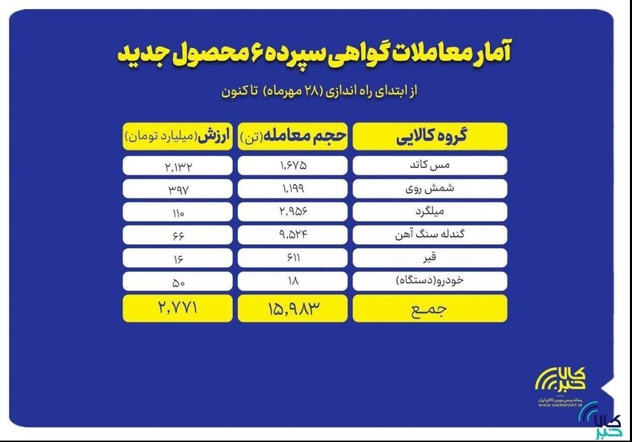 به گزارش پایگاه خبری «عصر بازار» به نقل از کالاخبر ،براساس آمار معاملات بورس کالای ایران، از 28 مهرماه تا پایان معاملات دیروز، معادل نزدیک به 16 هزار تن کالا به ارزش بیش از 2 هزار و 771 میلیارد تومان روی 6 دارایی جدید بازار گواهی سپرده کالایی معامله شده است.