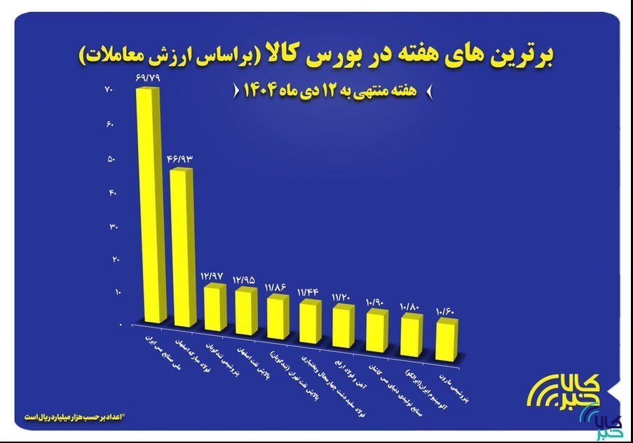 به گزارش پایگاه خبری «عصر بازار» به نقل از کالاخبر ، برترین های بورس کالای ایران در هفته منتهی به 12 دی ماه براساس ارزش فروش شرکت ها در بازار فیزیکی به شرح زیر است: