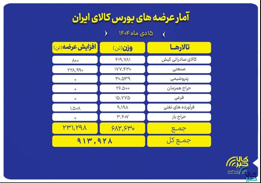 امروز در تالار صنعتی هم قرار است 406 هزار و 420 تن محصول شامل 398 هزار و 700 تن فولاد، 5 هزار تن مس، یک هزار و 720 تن روی، یک هزار تن آهن اسفنجی عرضه شود.