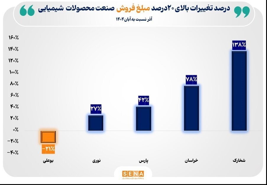 نماد «شخارک» با رشد 138 درصدی مبلغ فروش، بیشترین افزایش را در میان شرکتهای صنعت به ثبت رسانده است. مبلغ فروش این شرکت از یکهزار و 170 میلیارد تومان در آبان به 2 هزار و 792 میلیارد تومان در آذر رسیده است.وبزرگترین عامل در افزایش فروش این شرکت محصول متانول است که علیرغم کاهش 11 درصدی در قیمت، افزایش 154 درصدی در مقدار فروش، توانسته مبلغ فروش این شرکت را در این ماه افزایش دهد.