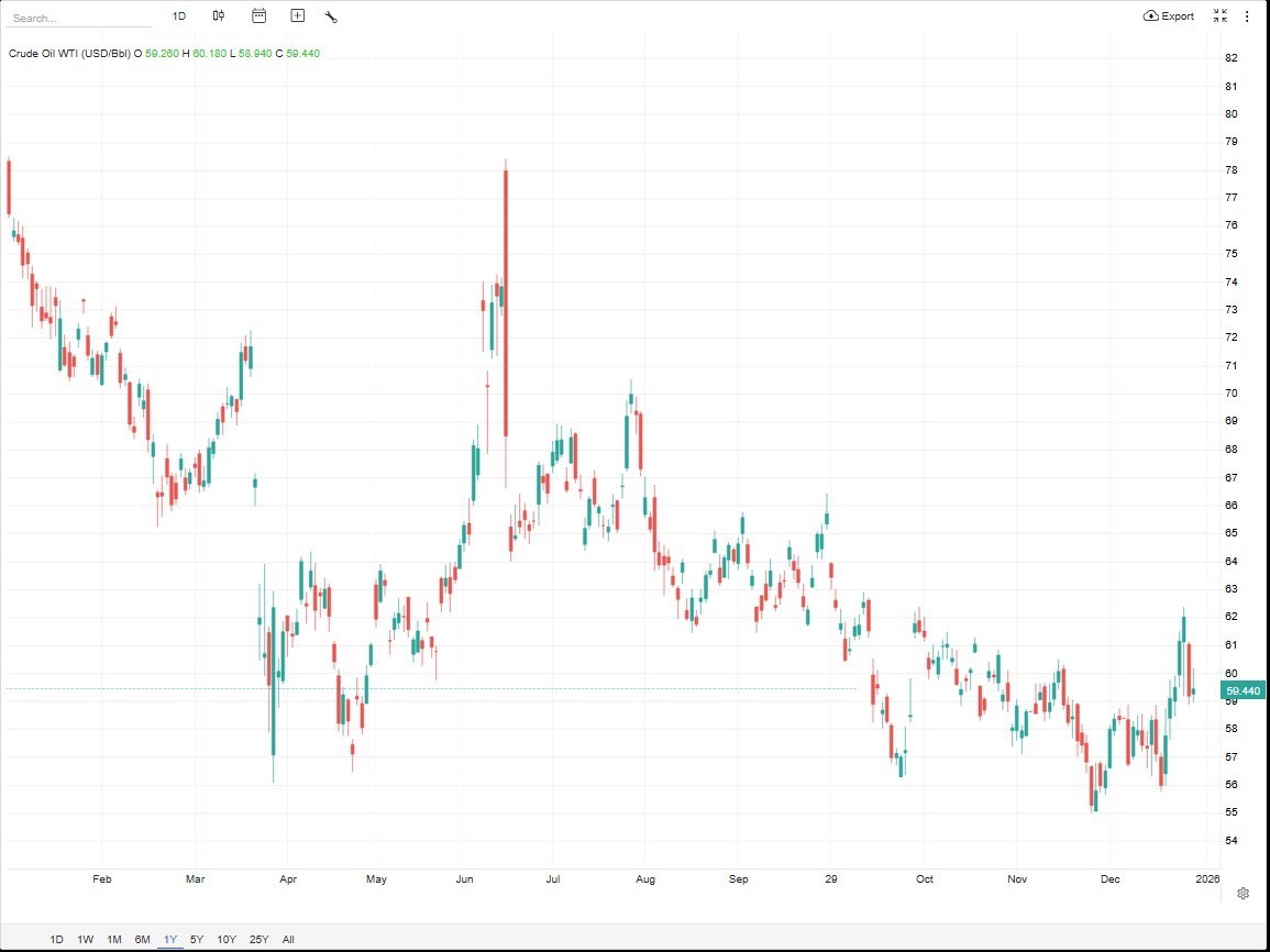به گزارش پایگاه خبری «عصر بازار» به نقل از مهر، معاملات آتی نفت خام وست تگزاس اینترمدیت (WTI) روز جمعه در حالی با 0.4 درصد افزایش به قیمت 59.44 دلار در هر بشکه رسید که هفته‌ای پرنوسان را با کف و سقف 58.45 و 62.36 دلار پایان رساند.
