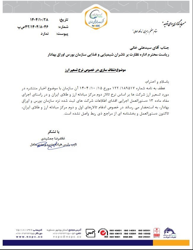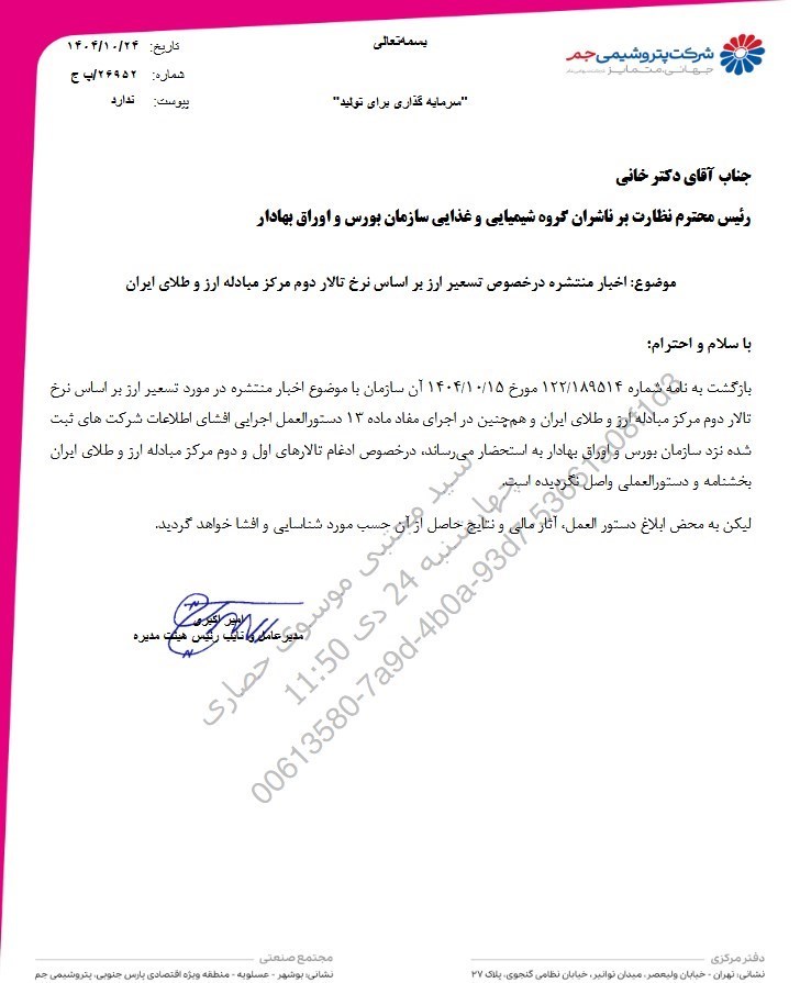 به گزارش خبرنگار پایگاه «عصربازار» به نقل از سنا، شرکت‌های «پتروشیمی جم»، «پتروشیمی نوری» و «دارویی آرایشی بهداشتی آریان کیمیا تک» با انتشار اطلاعیه‌های شفاف‌سازی جداگانه‌ای، در مورد اخبار منتشر شده در فضای مجازی مبنی بر تسعیر ارز بر اساس نرخ تالار دوم مرکز مبادله ارز و طلای ایران، اعلام کردند، درباره ادغام تالارهای اول و دوم مرکز مبادله ارز و طلای ایران، تاکنون بخش‌نامه و دستورالعملی دریافت نشده است.
