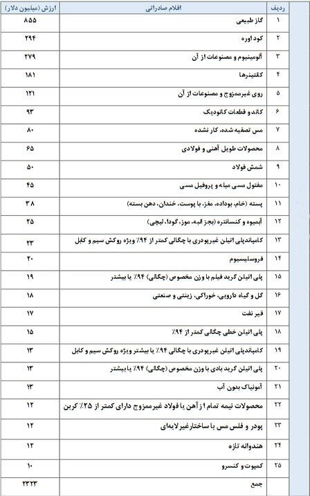 بررسی جزئیات صادرات کالا به ترکیه نشان می دهد که 25 قلم کالا در صدر صدور به ترکیه قرار دارد که گاز طبیعی با 855 میلیون دلار بیشترین سهم را در صادرات محصولات ایرانی به این کشور داشته است. در ادامه کور اوره با 294 میلیون دلار، آلومینیوم و مصنوعات از آن با 279 میلیون دلار، کانتینرها با 181 میلیون دلار، روی غیرممزوج و مصنوعات از آن با 121 میلیون دلار، کاتد و قطعات کانودیک با 93 میلیون دلار، مس تصفیه شده با 80 میلیون دلار، محصولات طویل آهنی و فولادی با 65 میلیون دلار، شمش فولاد با 50 میلیون دلار و مفتول مسی میله و پروفیل مسی با 45 میلیون دلار قرار دارد.