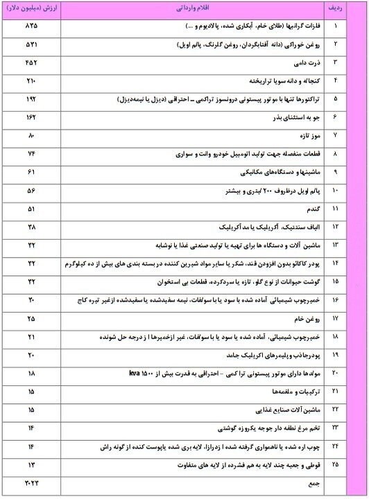بررسی وضعیت واردات ایران از ترکیه نیز نشان می دهد که 25 قلم در صدر کالاهای صادراتی ترکیه قرار دارد که فلزات گرانبها از جمله طلای خام، آبکاری شده، پالادیوم و ... با 835 میلیون دلار بیشترین سهم از واردات از ترکیه را به خود اختصاص داده است.