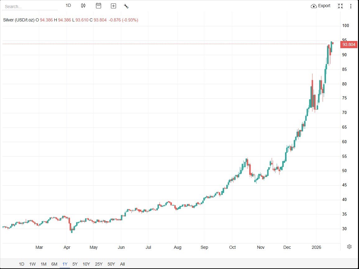 به گزارش پایگاه خبری «عصر بازار» به نقل از مهر، قیمت نقره روز سه‌شنبه 30 دی 1404، پس از ثبت سقف تاریخی 95 دلار و 11 سنتی در معاملات بعد از ظهر امروز که در پی تشدید تنش‌های تجاری میان آمریکا و اروپا رخ داد، اکنون با عقب نشینی جزئی و با افت 0.9 درصدی در محدود کمتر از 94 دلار به ازای هر اونس معامله می‌شود.