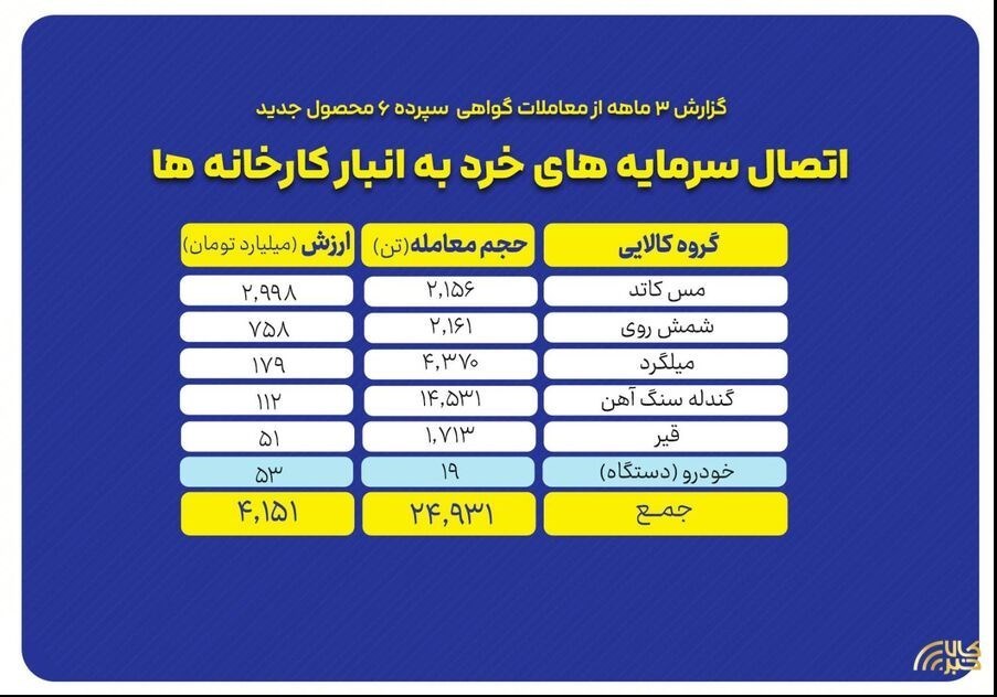 عصر بازار- ارزش معاملات گواهی سپرده ۶ محصول جدید در بورس کالا که سه ماه قبل راه اندازی شد به ۴ هزار و ۱۵۱ میلیارد تومان رسیده است. این گواهیها که شامل مس کاتد، شمش روی، میلگرد، قیر، گندله سنگ آهن و خودرو است، با حجم ۲۴ هزار و ۹۳۱ تن نشان داد که می توان از مسیر ابزار گواهی سپرده کالایی، سرمایه های خرد را به انبار کارخانه ها متصل کرد.
