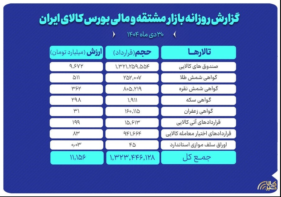 عصر بازار- روز گذشته در بازار مشتقه و مالی بورس کالای ایران بالغ بر یک میلیارد و ۳۲۳ میلیون قرارداد به ارزش ۱۱هزار میلیارد تومان منعقد شد.