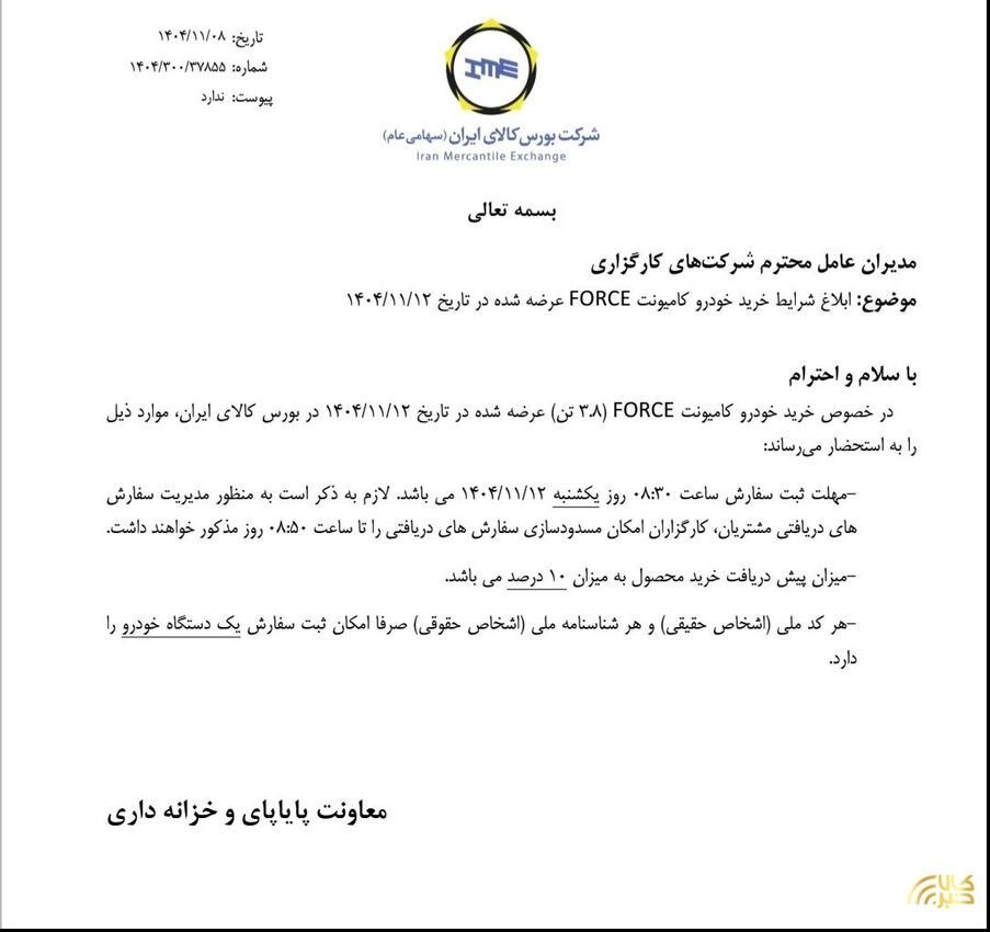 ابلاغ شرایط خرید کامیونت فورس
