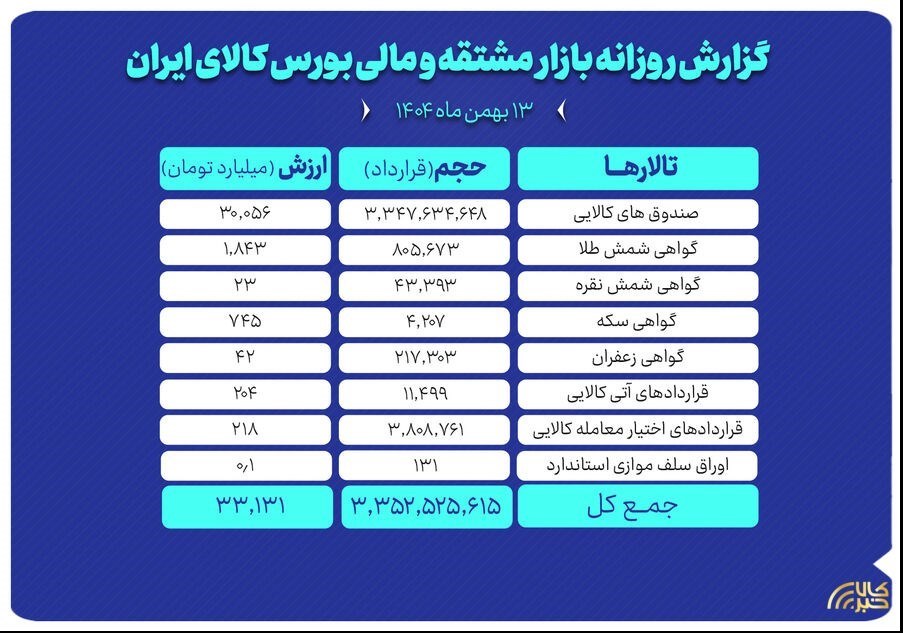 عصر بازار- روز گذشته در بازار مشتقه و مالی بورس کالای ایران بالغ بر ۳ میلیارد و ۳۵۲ میلیون قرارداد به ارزش ۳۳ هزار میلیارد تومان منعقد شد.