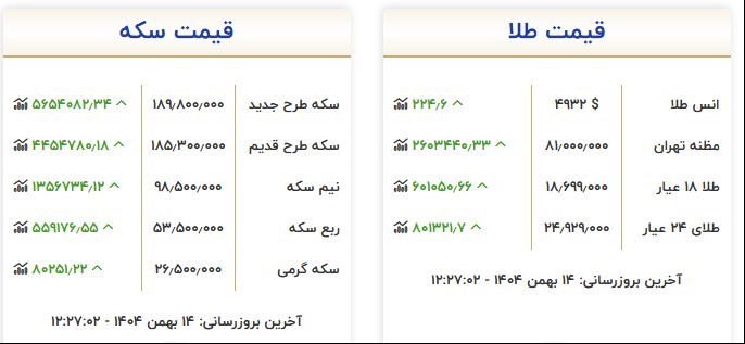 در بازار مسکوکات طلا نیز هر قطعه سکه تمام طرح جدید 189 میلیون و 800 هزار تومان و هر قطعه سکه طرح قدیم 185 میلیون و 300 هزار تومان معامله شد که در طرح جدید 5 میلیون و 654 هزار تومان و در طرح قدیم 4 میلیون و 454 هزار تومان افزایش قیمت ثبت شد؛ نیم سکه نیز با رشد یک میلیون و 356 هزار تومانی در کانال 98 میلیون و 500 هزار تومان قرار گرفت.