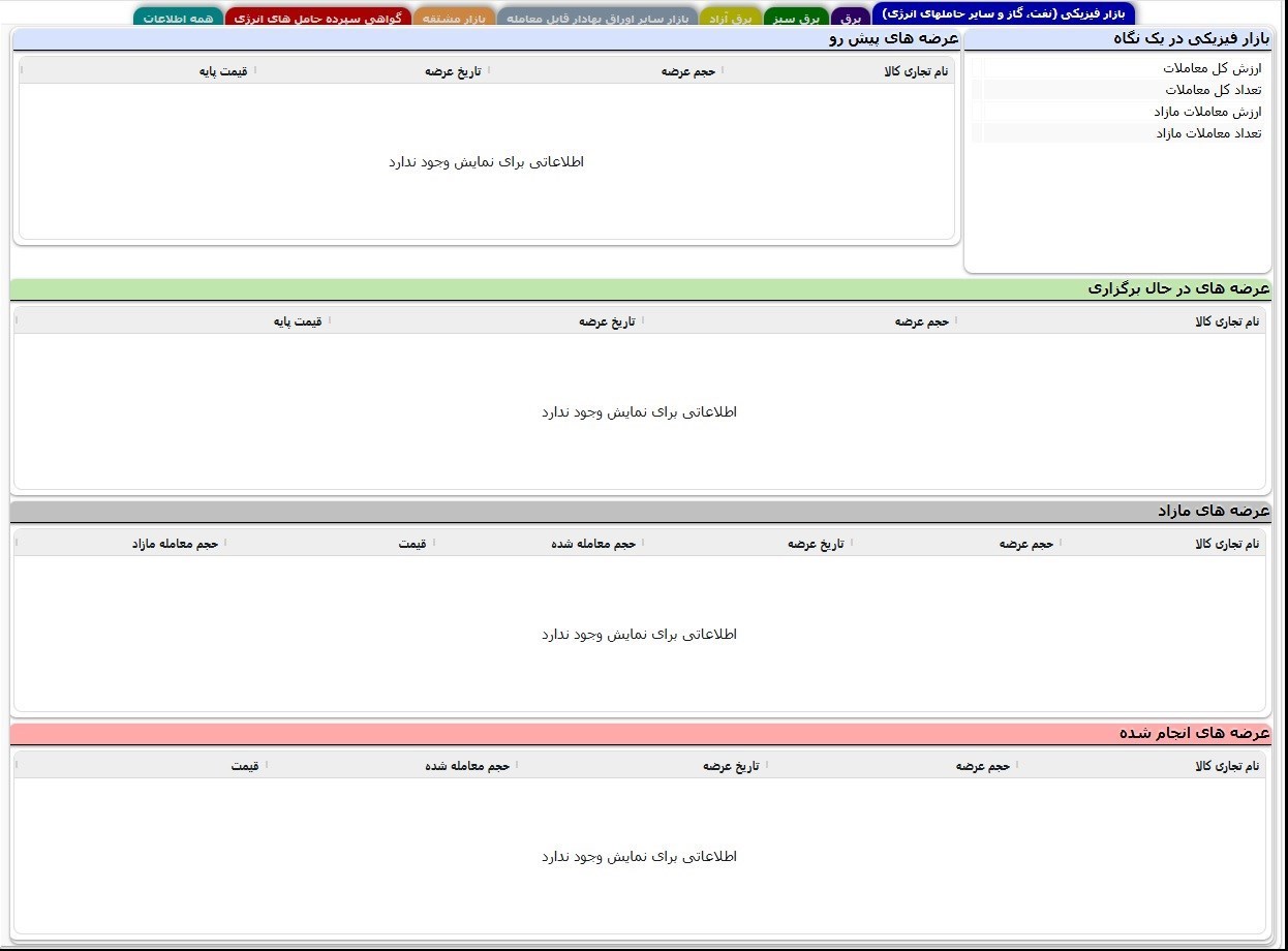 تالار معاملات نفت و فرآوردههای نفتی بورس انرژی نیز امروز نه در رینگ داخلی و نه بینالملل، هیچگونه معاملهای نداشت.