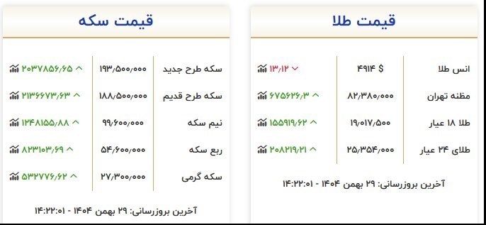 در بازار مسکوکات طلا نیز هر قطعه سکه تمام طرح جدید 193 میلیون و 500 هزار تومان و هر قطعه سکه طرح قدیم 188 میلیون و 500 هزار تومان فروخته شد که سکه تمام بیش از 2 میلیون تومان و طرح قدیم 2 میلیون و 136 هزار تومان رشد داشتند.
