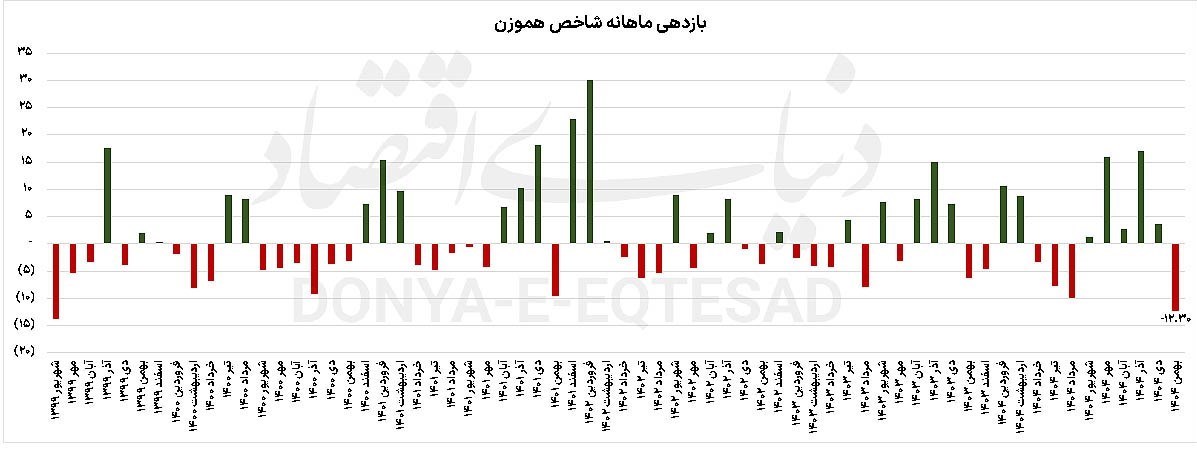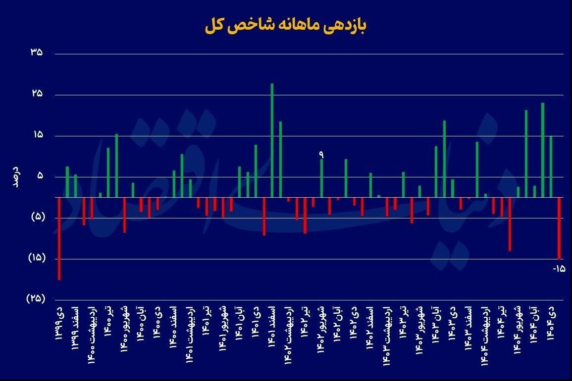 شاخص کل بورس، معاملات بهمن ماه را با افت 15 درصدی پشت سر گذاشت. افتی که بیشترین افت ماهانه این نماگر در 61 ماه اخیر محسوب می‌شود. آخرین بار که شاخص کل در مقیاس ماهانه، افت بیشتری را متحمل شده بود به دی ماه سال 99 برمی‌گردد که این شاخص 20 درصد از ارتفاع خود را در آن مقطع از دست داد. همچنین کاهش 15 درصدی شاخص کل در بهمن امسال، دومین عملکرد بد شاخص کل در مقیاس ماهانه و در تاریخ معاملات بورس تهران محسوب می‌شود. دیگر شاخص‌های سهامی نیز شاخص کل را در ریزش اخیر همراهی کردند. به گونه‌ای که شاخص هموزن، با کاهش 12.3 درصدی در دی ماه همراه شد و شاخص کل فرابورس نیز 15.3 درصد از ارتفاع خود را از دست داد. درحالی‌که شاخص کل در یازدهمین ماه سال با افت 15 درصدی همراه شد و ضعیف‌ترین عملکرد را در میان بازارها در دومین ماه زمستان ثبت کرد؛ دلار در بازار آزاد، 17.7 درصد بر ارتفاع خود اضافه کرد و در آخرین روز بهمن به کانال 163 هزار تومان رسید. هر گرم طلای 18 عیار نیز با ثبت بازدهی 30.8 درصدی در مقیاس ماهانه، بهترین عملکرد را در میان دارایی‌های مختلف از خود برجا‌ گذاشت. سکه با رشد 28 درصدی جایگاه دوم را به لحاظ عملکردی در بهمن ماه به خود اختصاص داد و دیگر دارایی‌های خانواده سکه و طلا یعنی نیم‌سکه و ربع‌سکه نیز به ترتیب با بازدهی 25 و 19 درصدی در رتبه‌های بعدی قرار گرفتند.