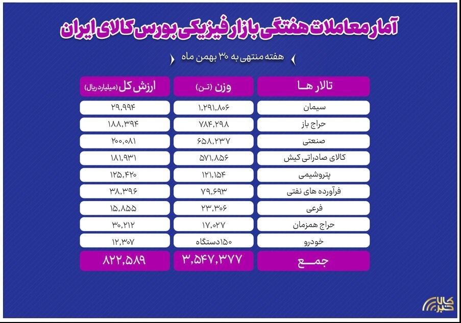عصر بازار- در معاملات هفته گذشته بازار فیزیکی بورس کالای ایران ۳ میلیون و ۵۴۷ هزار و ۳۷۷تن انواع محصول به ارزش ۸۲.۲ هزار میلیارد تومان دادوستد شد.