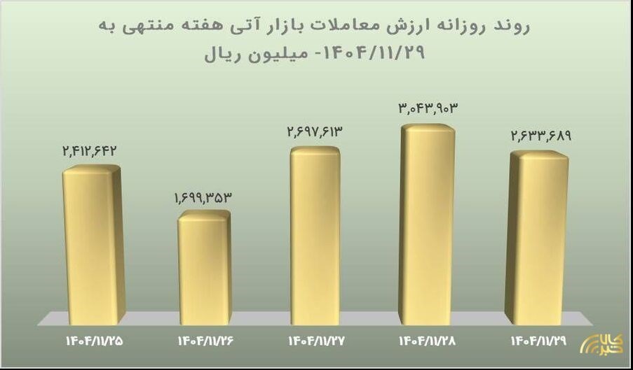 عصر بازار- بررسی روند معاملات قراردادهای آتی بورس کالای ایران درهفته منتهی به ۳۰ بهمن ماه نشان می دهد که در هفته گذشته ارزش معاملات بازار آتی به بیش از هزار و ۲۴۸ میلیارد تومان رسید.