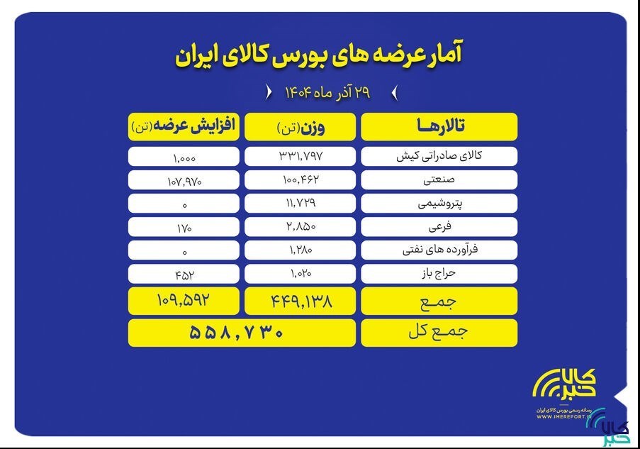 تالار صنعتی امروز میزبان عرضه 208 هزار و 432 تن محصول است. قرار است در این تالار 3 هزار و 103 تن تیرآهن، 30 هزار و 800 تن میلگرد، 90 هزار و 90 تن ورق، 68 هزار و 400 تن بلوم و بیلت، 13 هزار و 449 تن سیم فولادی و 2 هزار و 590 تن سیم و مفتول مسی عرضه شود.