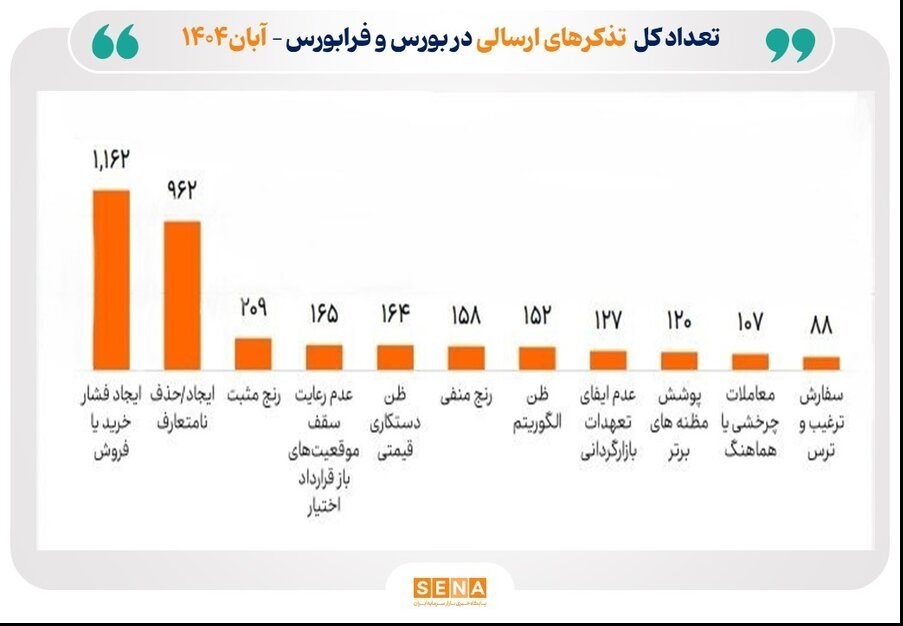 گزارشهای آماری حاکی از آن است که در آبان امسال، برخی معاملهگران در بورسهای کالا و انرژی 156 تذکر دریافت کردهاند که بیشترین تذکرها درباره ارسال قیمتهای نامتناسب با شرایط بازار با 71 مورد، رعایت نشدن محدودیتهای ثبت سفارش با 15 مورد، شوک قیمتی با 12مورد، رعایت نشدن مقررات در درج اطلاعیه عرضه با 10 مورد و ثبت و حذف نامتعارف سفارش با 8 مورد و کمترین آن درباره رعایت شرایط عرضه با 3 مورد، عدم توجه به پیام ناظر با 6 مورد و عدم حضور معاملهگر با 7 مورد بوده است.