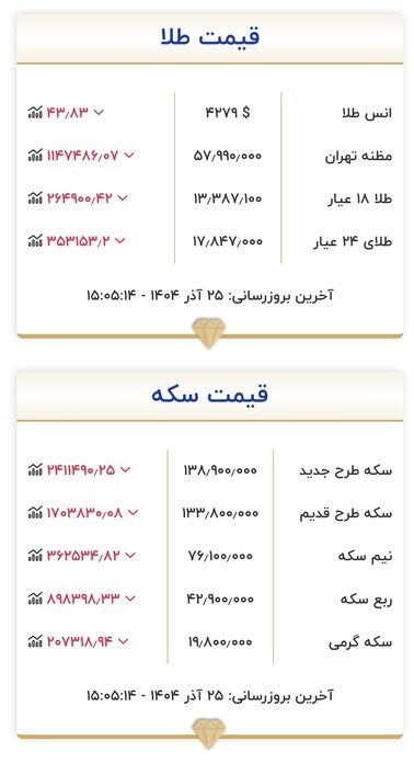 به گزارش پایگاه خبری «عصربازار» به نقل از ایرنا، اتحادیه طلا و جواهر تهران بهای هر اونس طلا را برای معاملات روز سه شنبه (25 آذرماه) چهار هزار و 279 دلار اعلام کرد که نسبت به دوشنبه بیش از 43 دلار کاهش یافت. اما به دلیل کاهش قیمت دلار در بازار غیررسمی، بهای انواع مسکوکات و مصنوعات طلا همچنان به روند صعودی خود پایان داد.