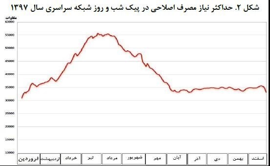 همانطور که در نمودار مشاهده میشود همه ساله با شروع ماه خرداد و افزایش مصرف برق، ضروری است حداکثر مصرف برق کشور در ساعات شبانهروز کاهش یابد یا اختلاف مصرف شب و روز در این روزها کاهش پیدا کند. در ماههای سرد سال یعنی از آبان تا فروردین میزان مصرف به کمتر از 35هزار مگاوات میرسد زیرا در ایران از برق برای مصارف گرمایشی کمتر استفاده میشود.