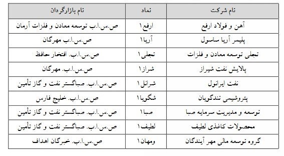به گزارش پایگاه خبری «عصر بازار» به نقل از سنا، پیرو اطلاعیه 22 فروردین شرکت فرابورس ایران با موضوع ضوابط مربوط به ماده 21 دستورالعمل فعالیت بازارگردانی در بورس تهران و فرابورس، پس از بررسی‌های صورت گرفته طی 6 ماهه منتهی به 12 مهر ماه سال جاری، 9 نماد به شرح جدول ذیل مشمول بندهای 2، سه و چهار ماده یک ضوابط یادشده هستند.