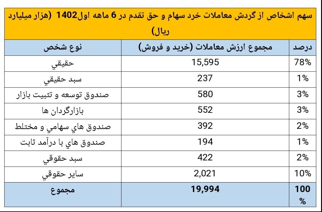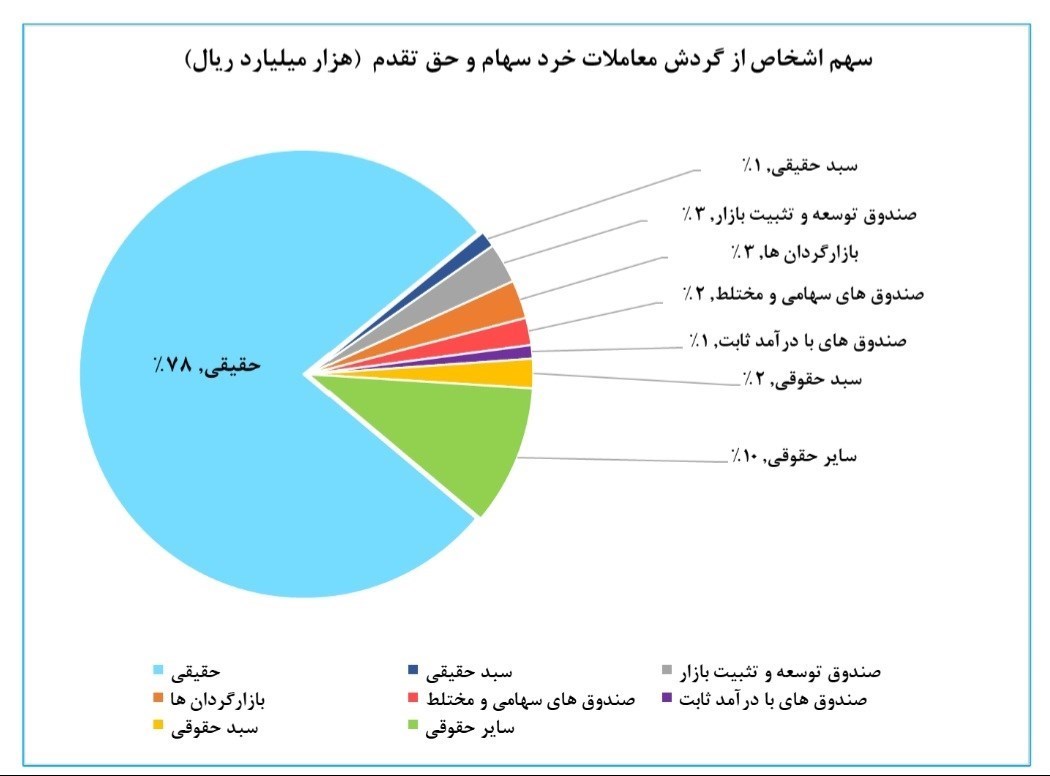 وی در پاسخ به مطالبات فعالان بازار درخصوص تنوع در انتشار اطلاعات معاملات انجام شده در بازار گفت: برای کسب شناخت بیشتر سرمایهگذاران از بازار سرمایه و ایجاد زمینه برای تقویت نگاه تحلیلی، مبلغ گردش معاملات سهام و نیز حق تقدم در نیمه ابتدایی سال جاری به تفکیک هر یک از اشخاص به شرح جدول و نمودار ذیل منتشر میشود.