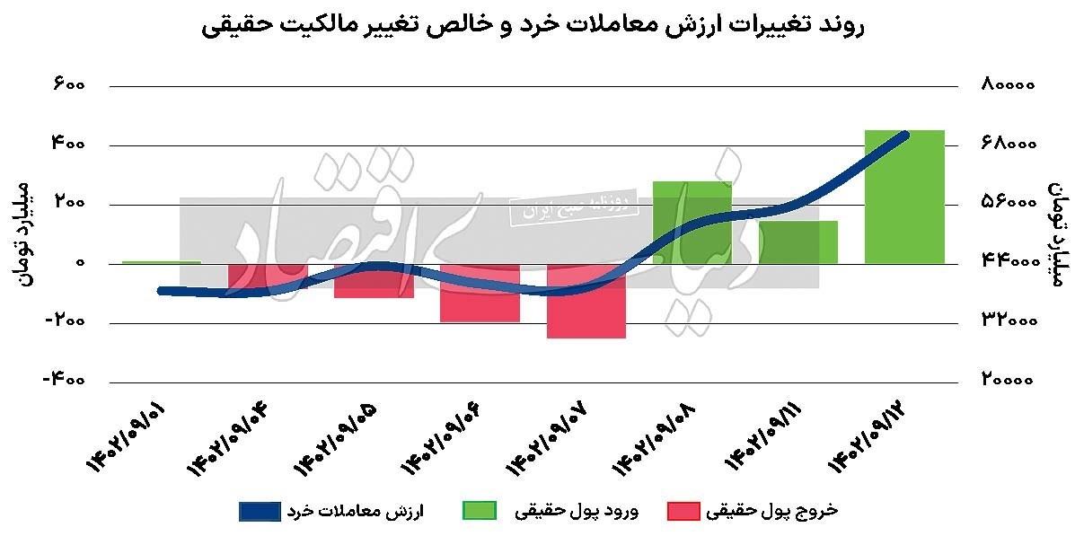 ارزش معاملات خرد بازار سهام نیز که شامل سهام و حقتقدم میشود، با ثبت رقم 7هزار و 22میلیاردتومان، بیشترین مقدار خود را از 20تیر امسال تجربه کرد. افزون بر این، اگر ارزش معاملات صندوقهای سهامی را نیز به رقم مذکور اضافه کنیم، ارزش معاملات رقم 8هزار و 404میلیاردتومان را نشان میدهد که رقم مذکور از ابتدای تابستان سالجاری بیسابقه بودهاست. بهعلاوه در جریان معاملات روز گذشته بورس تهران، 453میلیاردتومان نقدینگی حقیقی وارد بازار سهام شد که این مقدار از ورود پول حقیقی به گردونه معاملات سهام از 4 شهریور سالجاری بیسابقه بودهاست. بهاینترتیب خالص تغییر مالکیت مثبت به نفع پورتفوی حقیقیها در سه روز معاملاتی اخیر به 879میلیاردتومان رسیدهاست. سه صنعت فلزات اساسی، مخابرات و شرکتهای چندرشتهای صنعتی نیز در صدر صنایعی قرارگرفتند که با بیشترین ورود پول حقیقی همراه شدند.