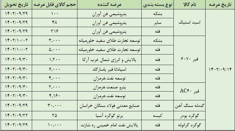 امروز دوشنبه 13 آذرماه نیز در تالار صادراتی بورس کالا 76 هزار و 640 تن قیر و 9 هزار تن گوگرد گرانوله عرضه شد که در نهایت 56 هزار و 440 تن محصول داد و ستد شد.