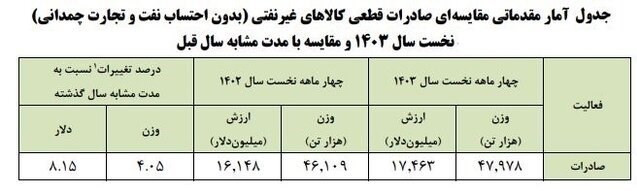 به گزارش پایگاه خبری «عصر بازار» به نقل از ایسنا، گمرک جمهوری اسلامی ایران طی گزارشی آمار تجارت خارجی کشور در چهارماه نخست سال جاری را منتشر کرد که براساس آن از ابتدای سال جاری تا پایان تیرماه، میزان صادرات قطعی کالاهای غیرنفتی کشور (به استثنای نفت خام، نفت کوره، نفت سفید و بدون صادرات از محل تجارت چمدانی، 47 هزار و 978 هزار تن به ارزش 17 هزار و 436 میلیون دلار (17.4 میلیارد دلار) بوده است که در مقایسه با مدت مشابه سال قبل (چهار ماه نخست سال 1402) افزایش 4.05 درصدی در وزن و 8.15 درصدی در ارزش دلاری داشته است.