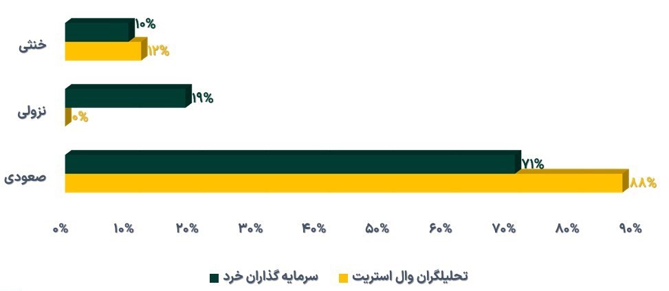 این هفته، 17 تحلیلگر وال استریت در نظرسنجی هفتگی کیتکو شرکت کردند. 2 نفر از کارشناسان (معادل 12 درصد)، انتظار دارند که قیمت طلا در هفته جاری بدون تغییر باقی بماند و 15 نفر (معادل 88 درصد)، پیشبینی افزایش قیمت را دارند. هیچ کدام از کارشناسان انتظار کاهش قیمت طلا را ندارند.